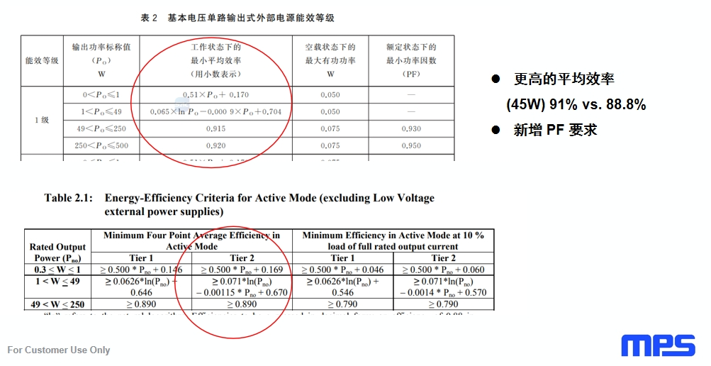 新國標(biāo)對(duì)電源能效提出了更嚴(yán)格的要求,以45W-49W功率段為例,其待機(jī)功耗需低于50mW,平均效率要求較歐盟標(biāo)準(zhǔn)高出約2個(gè)百分點(diǎn)。尤為關(guān)鍵的是,新標(biāo)將以往分別考量的“輕載功耗”(內(nèi)置電源)與“待機(jī)功耗”(外置電源)合并考核,對(duì)實(shí)際應(yīng)用場景中的能效表現(xiàn)提出了全面挑戰(zhàn)。這意味著,電源設(shè)計(jì)必須在拓?fù)?、控制算法和系統(tǒng)集成度上尋求根本性突破。