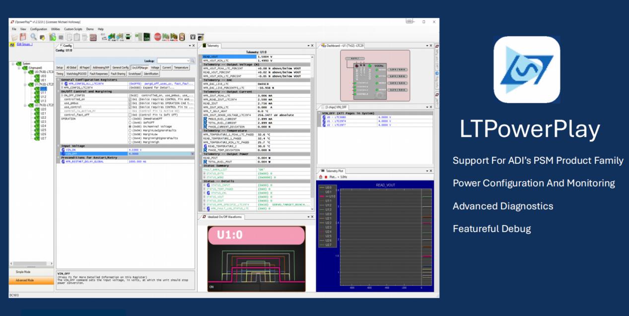 LTpowerPlay可用于對ADI的數(shù)字電源系統(tǒng)管理(PSM)IC進(jìn)行配置、監(jiān)測與調(diào)試。它支持許多不同的任務(wù),包括在離線模式 (沒有硬件) 下構(gòu)建可在日后保存和重新加載的多芯片配置文件。它能自動生成波特圖,幫助工程師無需手動測量即可快速完成環(huán)路補(bǔ)償設(shè)計(jì),并輕松讀取和調(diào)整系統(tǒng)參數(shù),定位故障點(diǎn)。