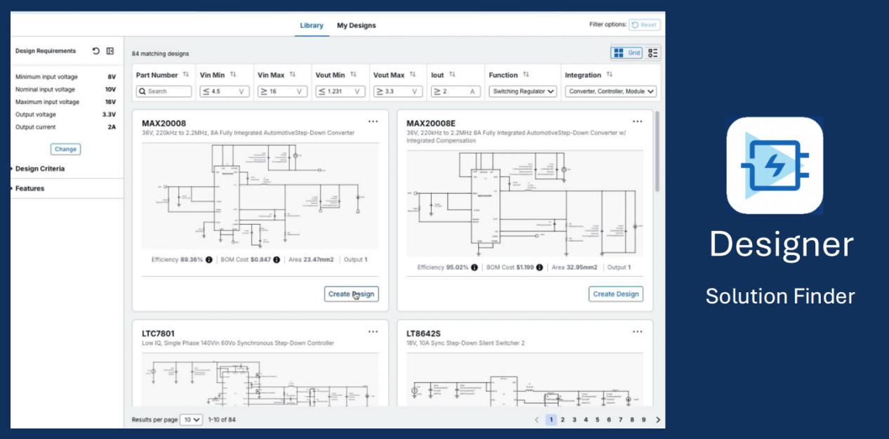 而第二個階段是設(shè)計(jì)部分。在確定了大架構(gòu)后,ADI Power Studio Designer提供經(jīng)過優(yōu)化的器件、元件或 IC推薦,并生成包含外圍無源器件的完整電路原理圖。工程師可即時看到效率、功耗等關(guān)鍵指標(biāo)的估算結(jié)果,并輕松比較不同器件的性能、尺寸和成本,進(jìn)行快速權(quán)衡。作為一款強(qiáng)大的IC級電源設(shè)計(jì)網(wǎng)頁端工具,Power Studio Designer提供引導(dǎo)式工作流程,讓工程師能夠設(shè)置關(guān)鍵參數(shù),放心地進(jìn)行仿真、配置和評估。而且Designer支持的器件類型與產(chǎn)品來源無關(guān)。