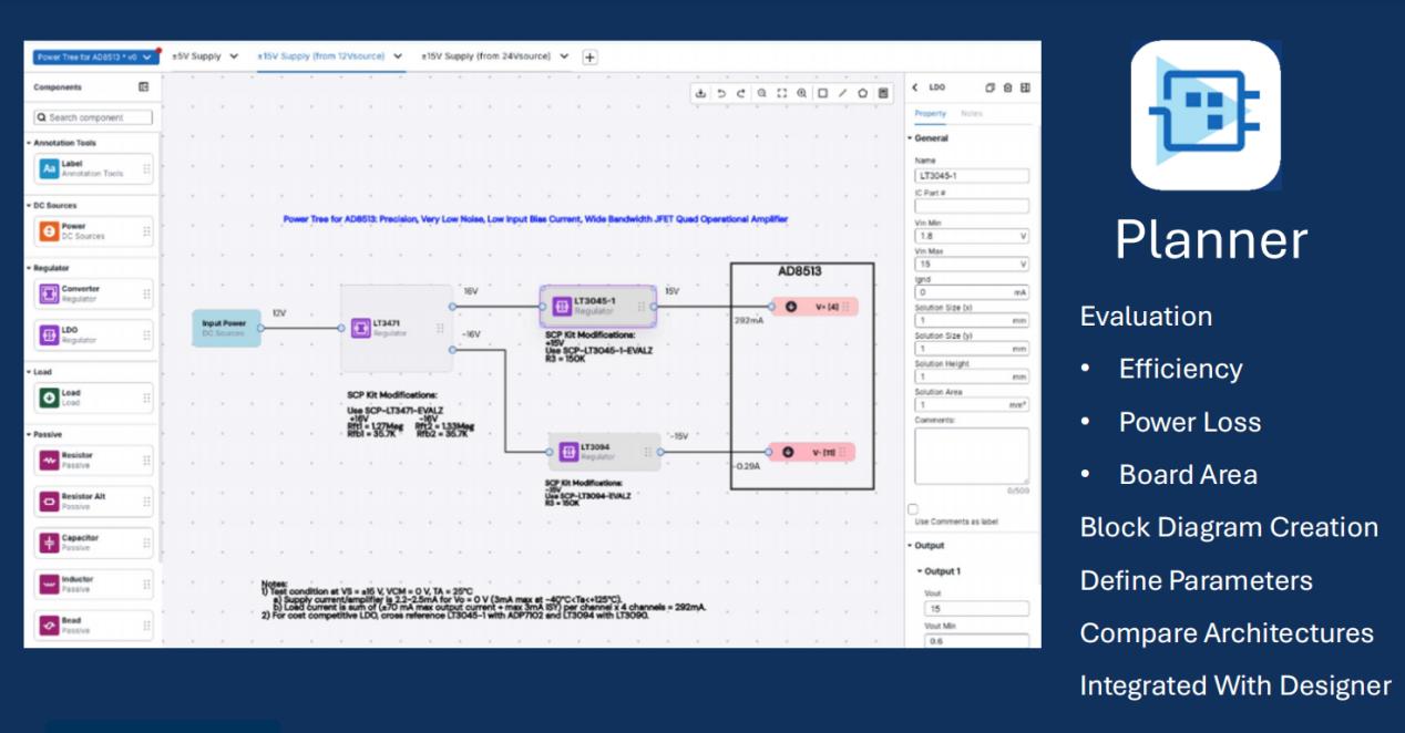 新推出的Power Studio Planner工具不僅能用于系統(tǒng)規(guī)劃,還能幫助設(shè)計(jì)電源樹或電源架構(gòu),這是在系統(tǒng)層面使用的工具。而在完成整體系統(tǒng)架構(gòu)后,選擇合適的元件以滿足應(yīng)用需求,則是在Power Studio Designer部分完成的。兩款工具均為網(wǎng)頁端應(yīng)用,支持即時更新和AI輔助的參數(shù)搜索。同時這兩款新工具與ADI Power Studio全套產(chǎn)品系列(包括LTspice、SIMPLIS、LTpowerCAD、LTpowerPlanner、EE-Sim、LTpowerPlay和LTpowerAnalyzer)相結(jié)合,能夠有效簡化整個電源系統(tǒng)設(shè)計(jì)流程。