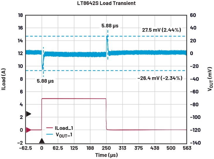 圖2顯示了LT8642S的負載瞬變。負載電流在500 ns內(nèi)從100 mA提高到5 A,并在250 µs后又迅速降低。電壓峰值約為27.5 mV,電壓谷值約為26.4 mV。