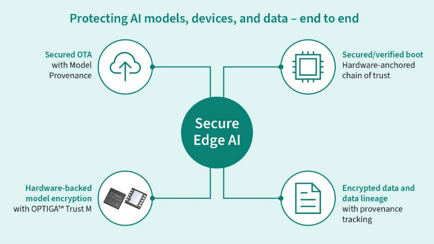 Thistle設(shè)備安全平臺采用了英飛凌 OPTIGA™ Trust M 安全解決方案,提供即用型云托管安全組件,可無縫集成到基于 Linux OS的設(shè)備和微控制器中。原始設(shè)備制造商(OEM)無需構(gòu)建和維護(hù)一次性網(wǎng)絡(luò)安全棧,而是能在數(shù)小時(shí)內(nèi)部署一個(gè)經(jīng)過驗(yàn)證且持續(xù)更新的基礎(chǔ)架構(gòu),并將其擴(kuò)展至大規(guī)模異構(gòu)設(shè)備群。該安全平臺支持安全啟動與空中下載(OTA)更新,兼容各類微處理器、系統(tǒng)級芯片(SoC)和微控制器。英飛凌OPTIGA™ Trust M安全控制器可實(shí)現(xiàn)安全密鑰配置、防篡改密鑰存儲,及高效的加密解密運(yùn)算,確保只有可信且經(jīng)過認(rèn)證和驗(yàn)證的AI模型才能被部署到邊緣AI應(yīng)用中。