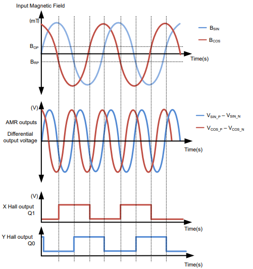 TMAG6180-Q1 2D AMR 角度傳感器可測(cè)量磁場(chǎng),并產(chǎn)生兩個(gè)與這些磁場(chǎng)成正比的差分(或單端)電壓輸出。TMAG6180-Q1 的延遲低于 2µs,還可以更大限度地降低高速運(yùn)動(dòng)引起的角度誤差。集成的霍爾效應(yīng)開(kāi)關(guān)可產(chǎn)生兩個(gè)數(shù)字象限輸出(Q0 和 Q1),從而將角度檢測(cè)范圍擴(kuò)展到 360 度。結(jié)合正弦和余弦波形,Q0 和 Q1 數(shù)字輸出足以確定絕對(duì)旋轉(zhuǎn)角度。圖 4 是 TMAG6180-Q1 的功能方框圖,圖 5 則顯示了輸出波形。