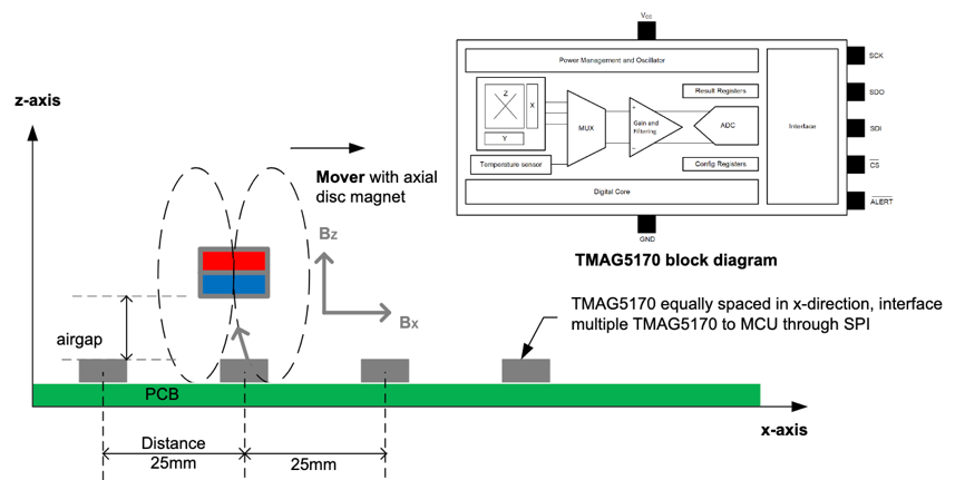 圖 3:直線電機(jī)運(yùn)輸系統(tǒng)中的 TMAG5170